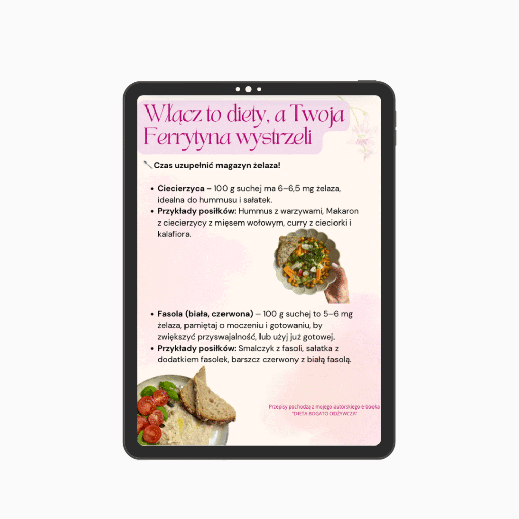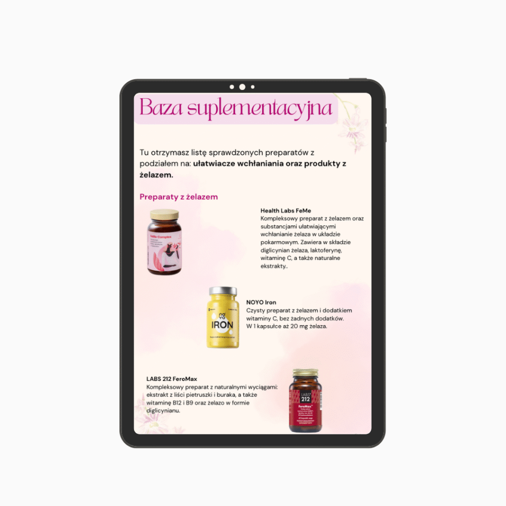 📖 przykładowe jadłospisy i zdjęcia posiłków, które pomogą Ci uzupełnić „magazyn żelaza”,